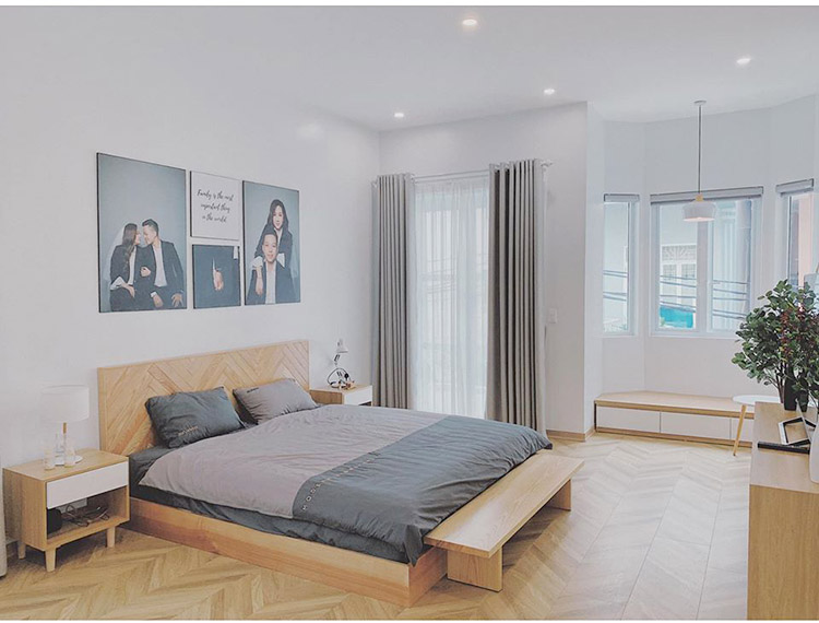 Không gian phòng ngủ của anh chị cũng lựa chọn tối giản, sử dụng gỗ tự nhiên cho không gian thêm sang trọng, thêm vào những ô của kính giúp mọi không gian luôn tràn ngập ánh sáng và gió tự nhiên.